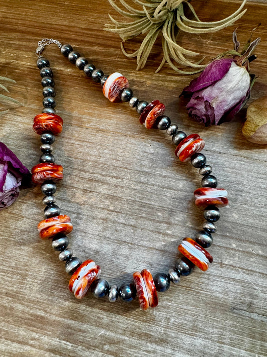 NFR Collection Necklace – Spiny Oyster & Turquoise with 6mm Sterling Silver Pearls – Handmade by The Bijoux FAB – 32.5"