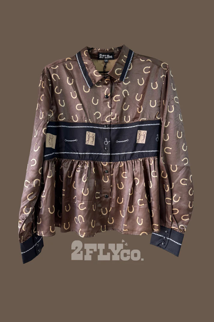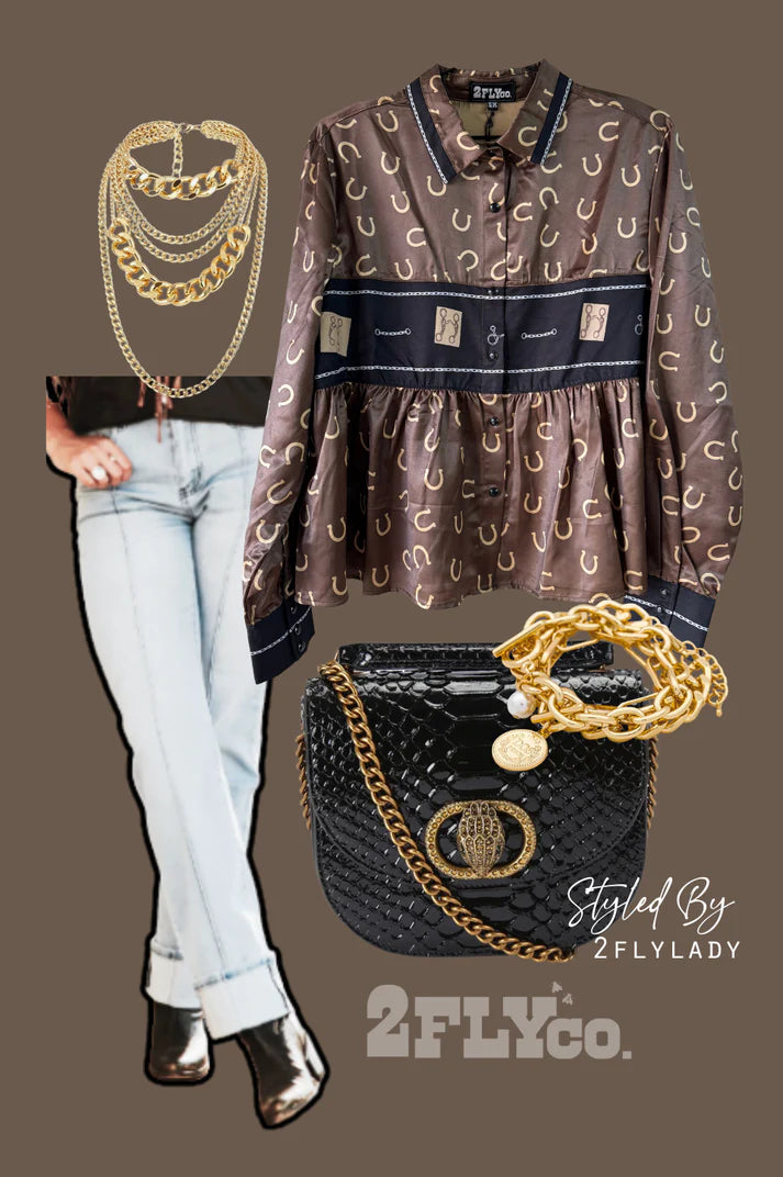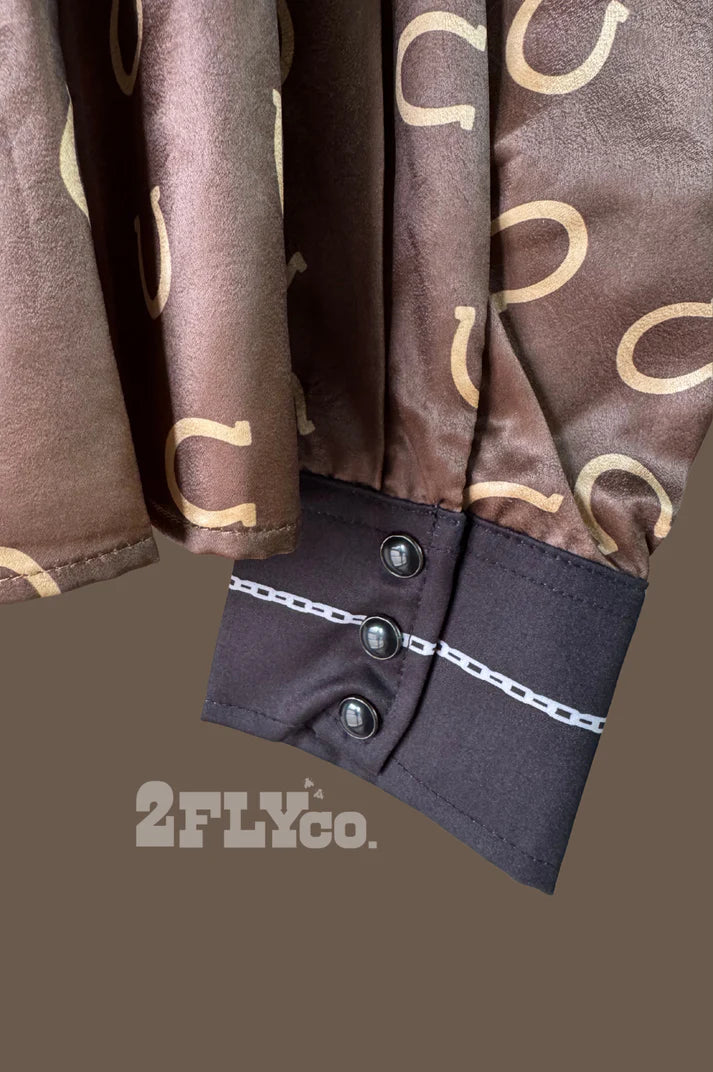 it's giving all the western feels -- horseshoe body along with chain details on collar and cuffs, AND a black band with bit graphics.