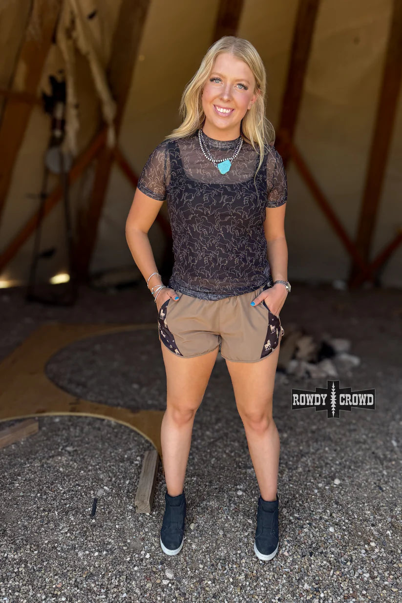 Ride, Sally, Ride! You'll want to in the Mustang Ridge Shorts. These are a taupe colored athletic short with a liner inside. These are perfect for the lake, or any hot summer day! The sides feature a mustang print along with some tiny X's to complement your favorite Rowdy Crowd Tee!