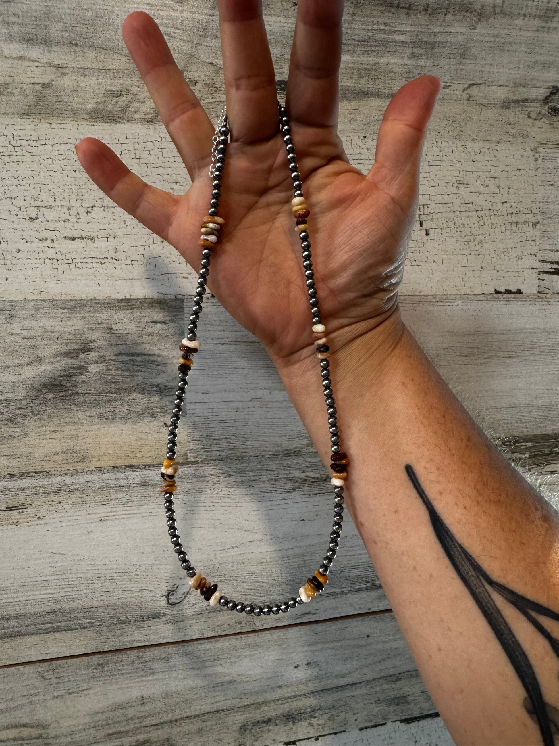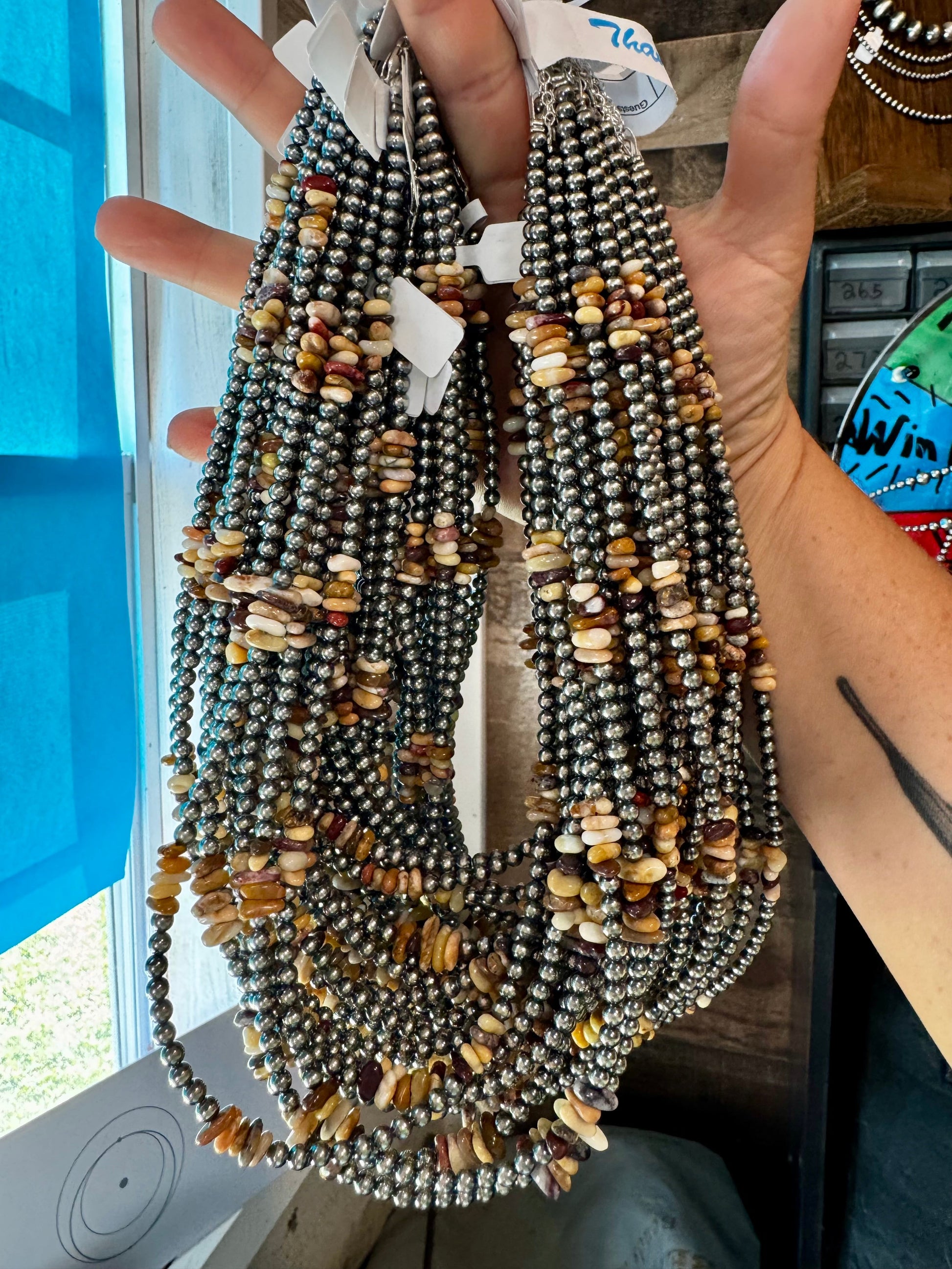 Handmade in the USA by The Bijoux FAB, this necklace combines 4mm sterling silver pearls with natural chip Nevada opal stones. Each opal is completely unique in shape and color, ranging from earthy neutrals to shimmering iridescence. The necklace is finished with a sterling silver (.925) clasp and extender for a secure and adjustable fit. Measuring 19 inches plus extender, it’s a gorgeous piece that transitions beautifully into fall.