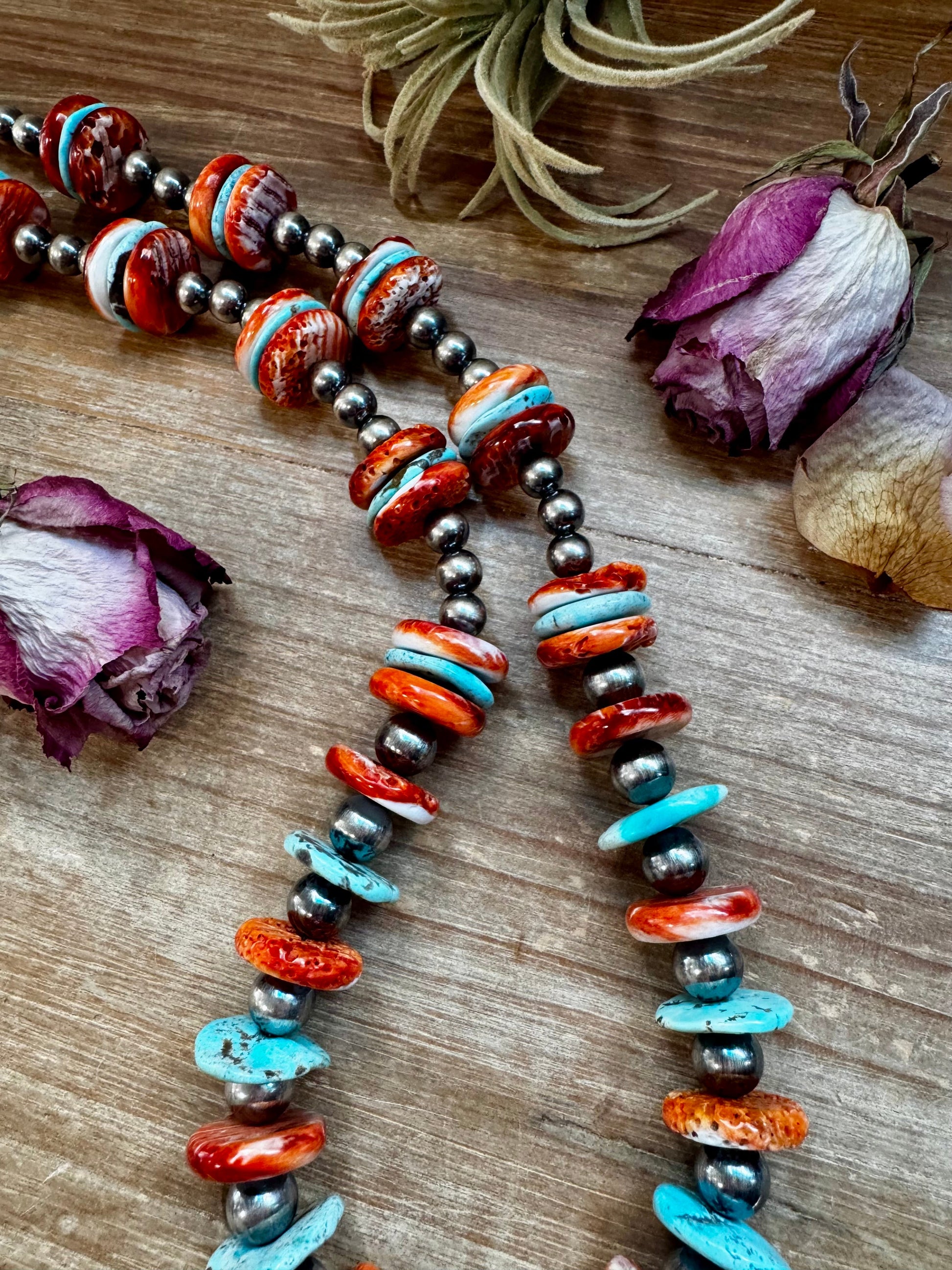NFR Collection Necklace – Sterling Silver Pearls with Blue Turquoise & Spiny Oyster – Handmade by The Bijoux FAB – 29"