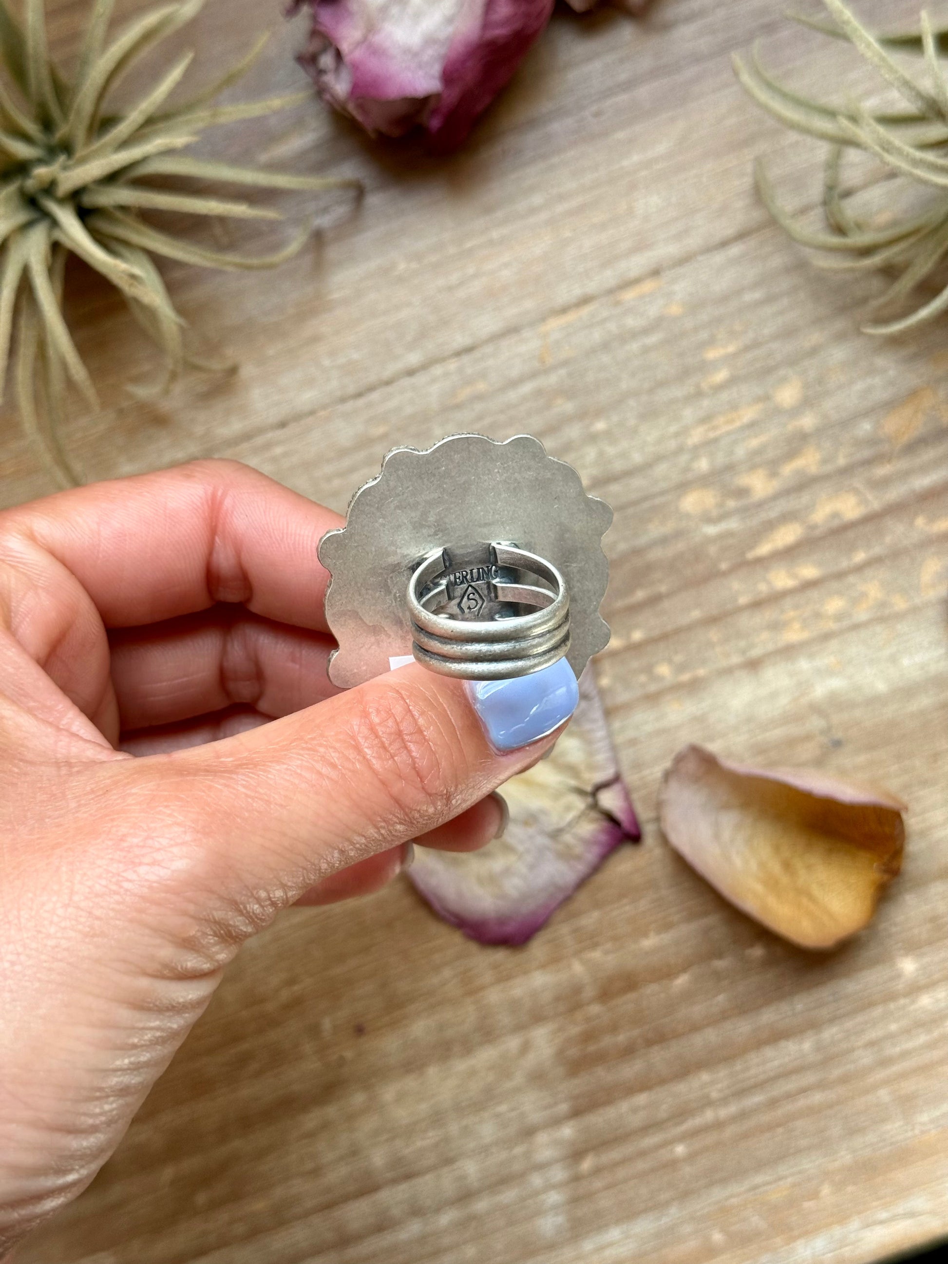 This Orange Spiny Oyster Mosaic Cluster Ring is a stunning statement piece handmade by artist Shay Pfeiffer in solid sterling silver. The ring features a vibrant mosaic of genuine Orange Spiny Oyster stones, arranged in a bold cluster design that captures the warmth and energy of the Southwest. Each ring is stamped “Sterling” and marked with the artist’s hallmark, representing true craftsmanship and collectible quality. A show-stopping piece that adds color, artistry, and personality to any collection.