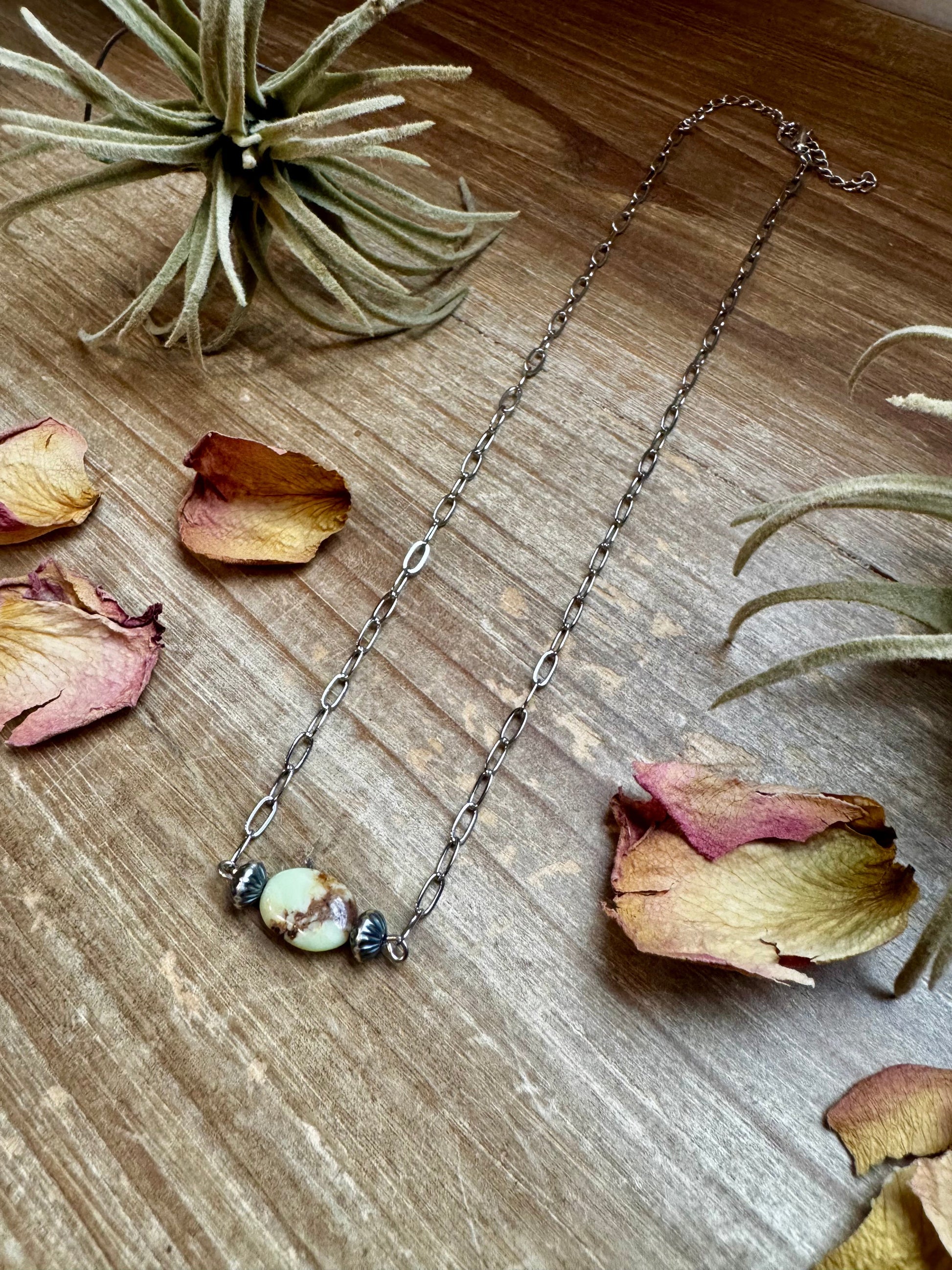 This 16-inch necklace is handmade by us in North Texas, featuring two Saucer sterling silver pearls and one bold lemon turquoise magnesite bead as the centerpiece. The sides are finished with a sleek silver-plated chain, giving it the perfect balance between rustic and modern.