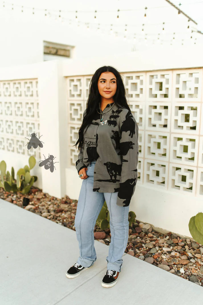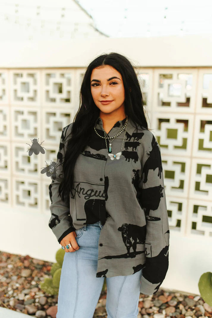 usually i start off with the pattern BUT let me start off with saying HOW AMAZINGLY SOFT AND COMFY THIS MATERIAL is. it's lightweight COTTON and breathable. and PLUS side it's a pattern dedicated to ANGUS cattle. Neutral/Monochromatic vibe. easy one to style.