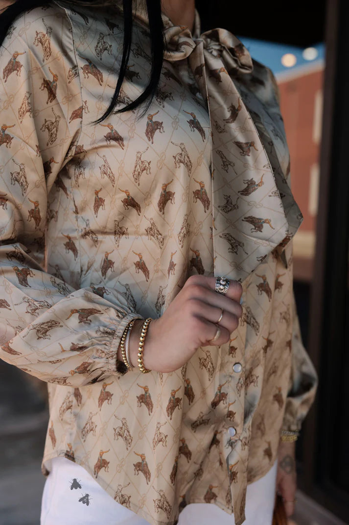 it's got the ties at the top for that upscale blousy look and a satin feel. style with some wide leg crop jeans or some brown leather shorts, and TALL brown boots ... ummmm YESS MA'AM. the cuff on this one isn't like our other tops it's a elastic band cuff -- meant to let the sleeve have a more blousy sleeve vibe.