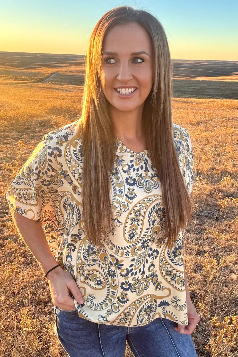 Meet the Cactus Kreek Top—your new favorite way to add a splash of whimsy to your closet! This cream-colored beauty features a stunning paisley design in jewel tones of green, turquoise, and mustard that'll have you turning heads. Perfect for mixing and matching with your everyday essentials, this playful piece brings just the right amount of personality without trying too hard. Comfort meets style in the most delightful way.