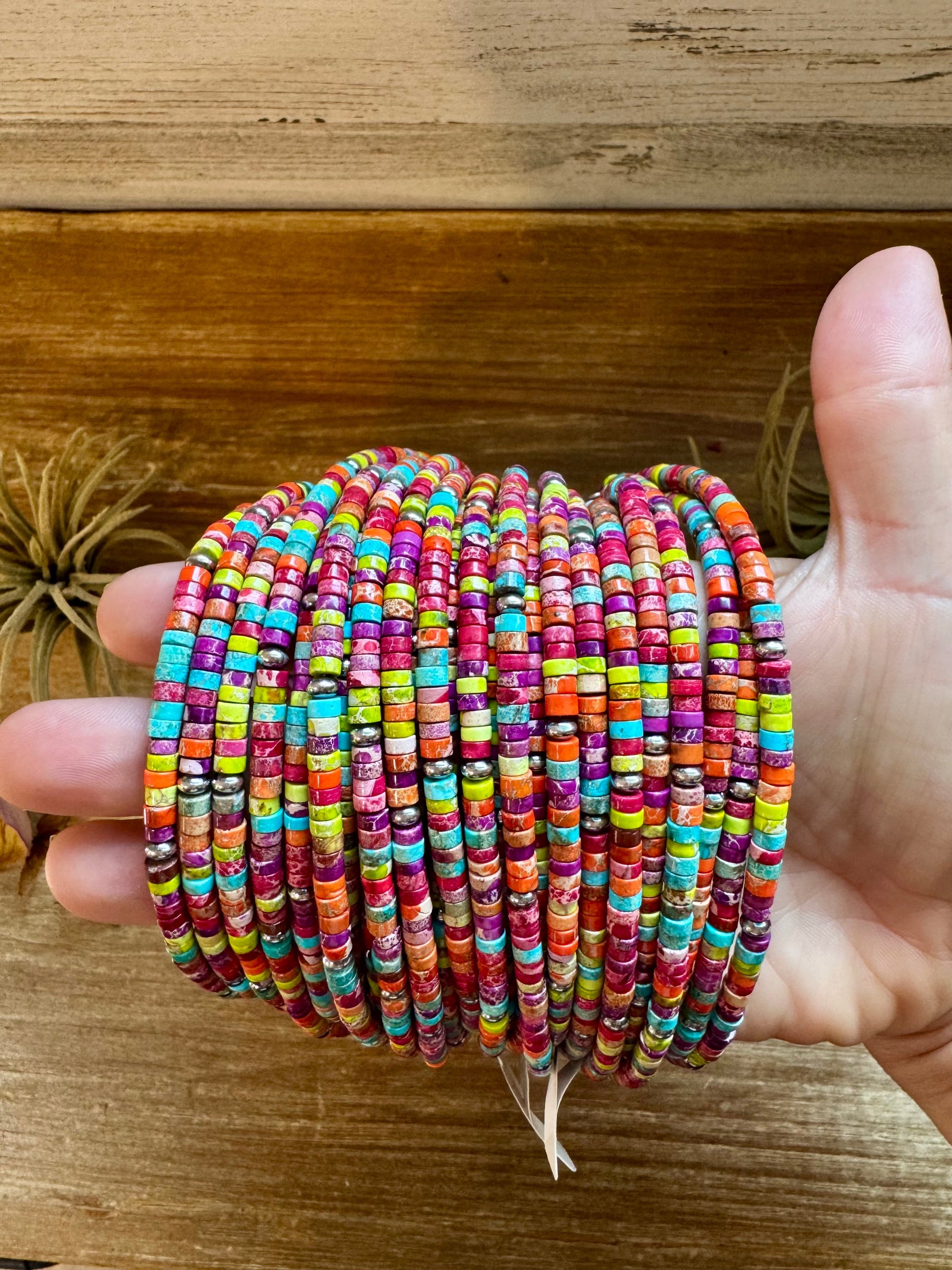 Handmade in the USA by The Bijoux FAB, this 14-inch choker is crafted with 4mm magnesite heishi beads and accented by 4mm sterling silver saucer pearls. The combination of earthy magnesite and bright silver makes this piece perfect for layering or wearing on its own. Finished with a silver-plated lobster clasp and chain, it includes a 3-inch extender for adjustable wear. Lightweight and versatile, this choker is a must-have for Southwestern-inspired stacks.