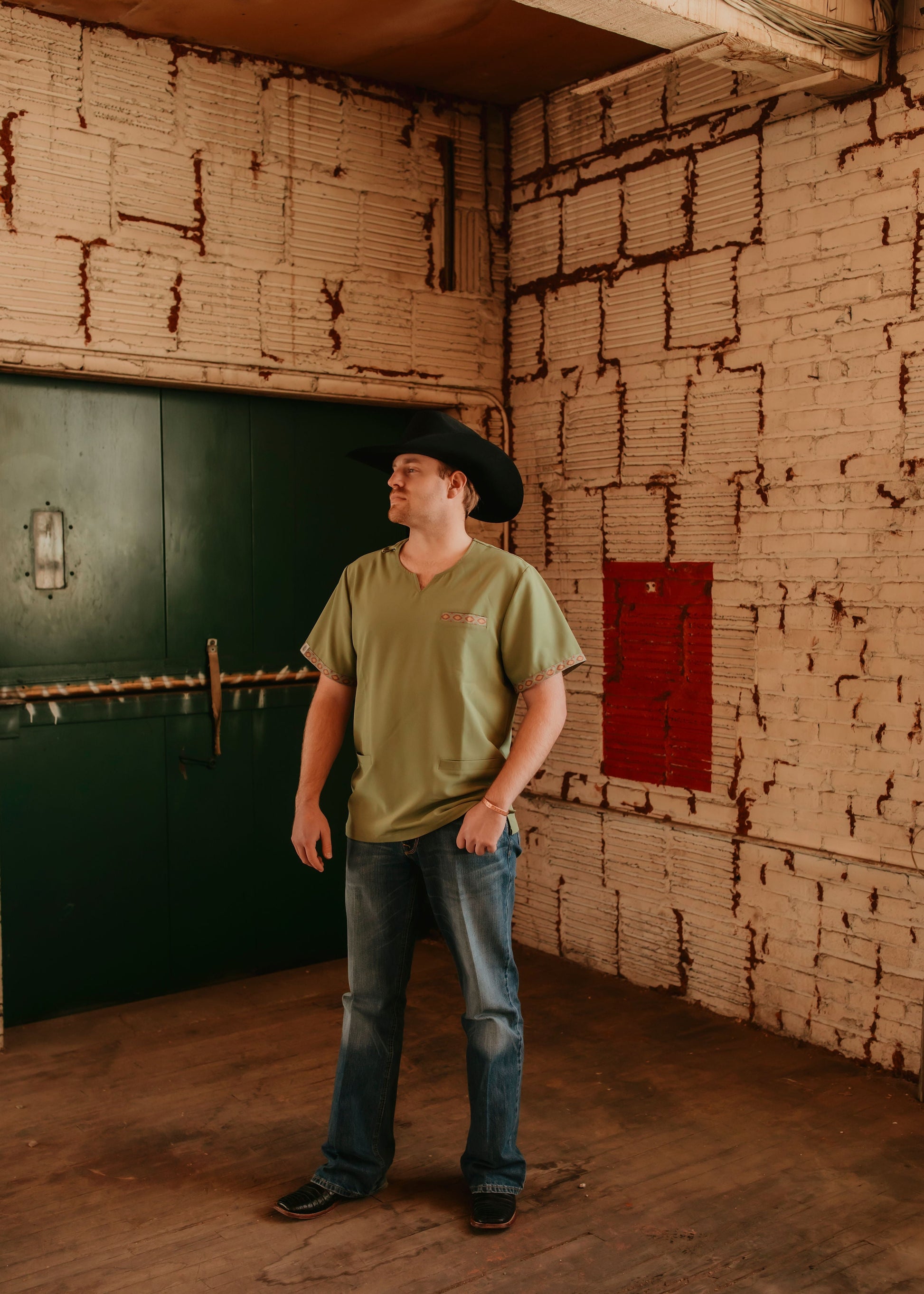 Tops include two lower front pockets, one upper chest pocket, and right-shoulder badge reel clip attachment.