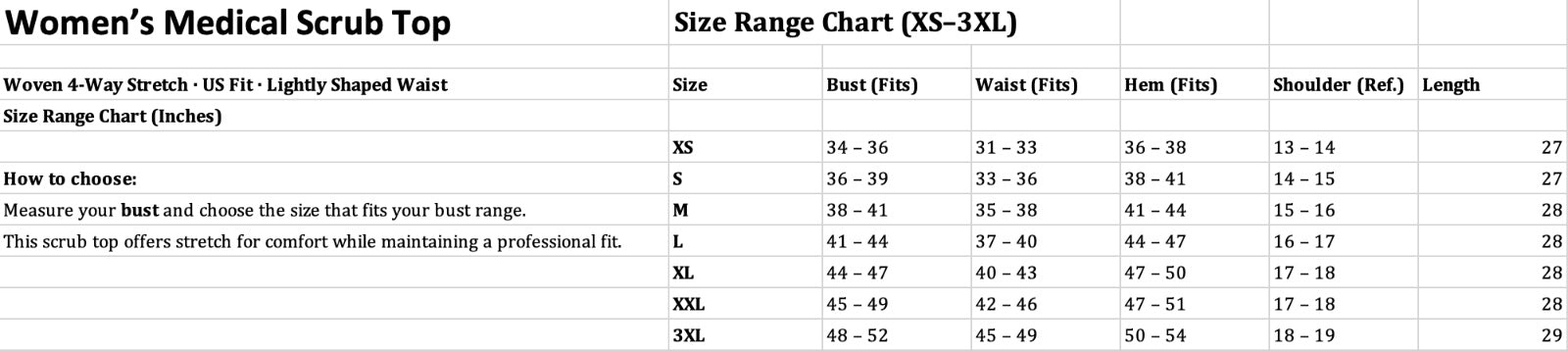 | Size | Bust (Fits) | Waist (Fits) | Hem (Fits) | Shoulder (Ref.) | Length |
