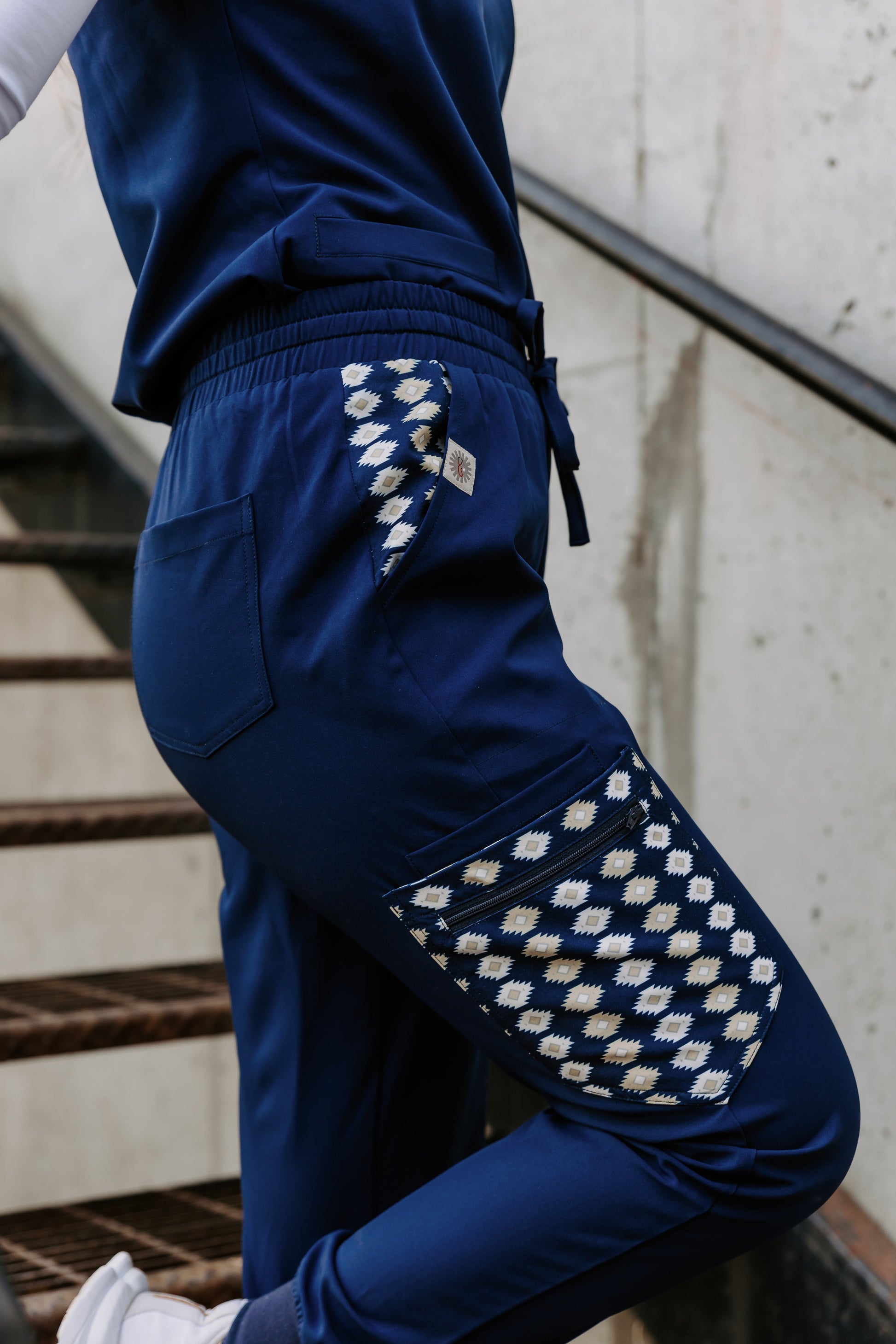 Jogger styled pants, made of a polyester/spandex blend. Drawstring ties, front and back pockets, and a TRIPLE lower leg/variety pocket.