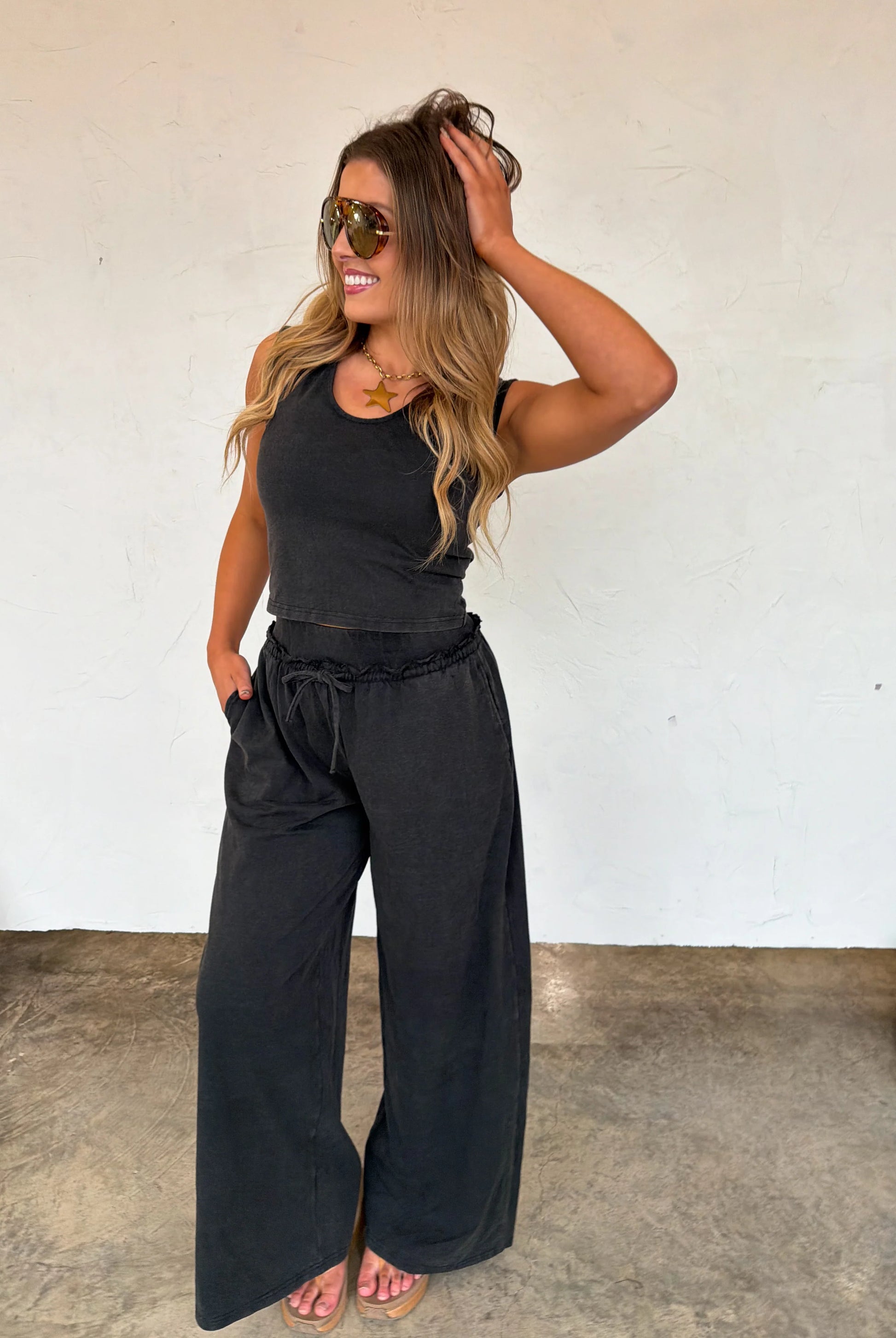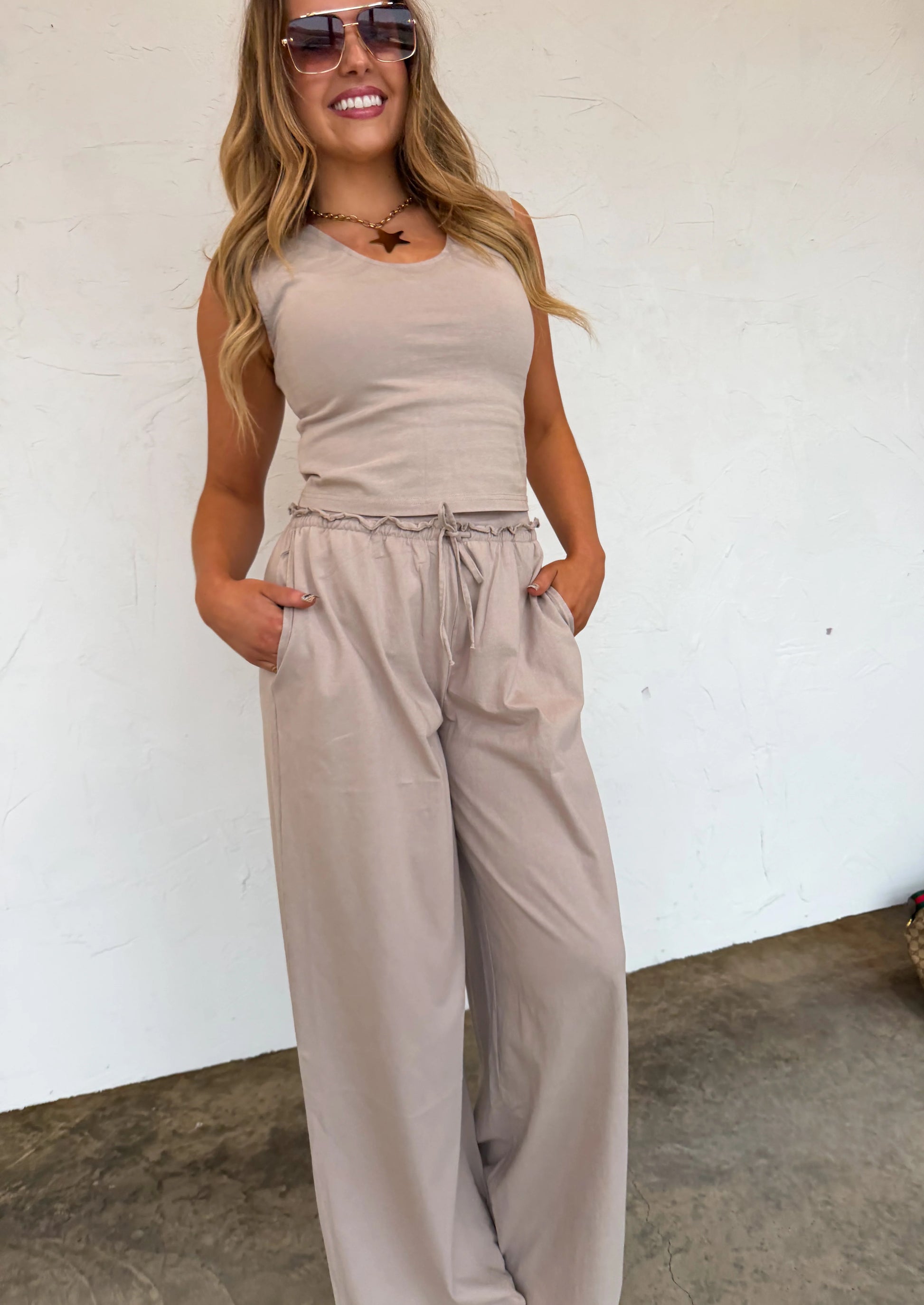 This comfy sets are the SOFTEST and most comfortable thing to put on your body!! The cute v-neck tank style top features flattering slight capped sleeves with a perfect fitted look . Bottoms are relaxed fit, wide-leg and have raw seam detail hem on the waistline with an elastic waist and working drawstring . Pair this cute set with sneakers or slides for an easy, put-together look that’s as comfortable as it is chic.