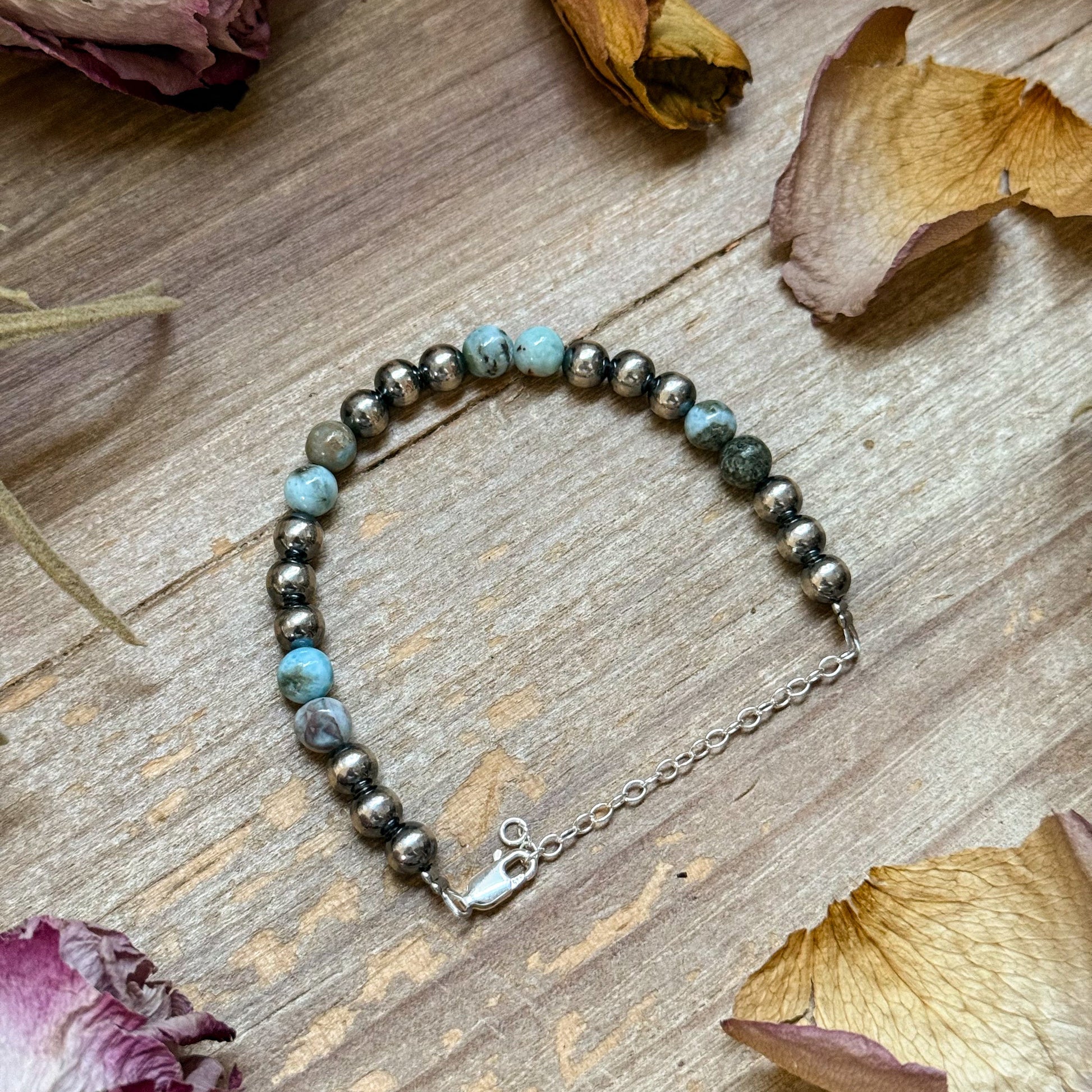 Featuring 6 mm sterling silver pearls paired with smooth 6 mm Larimar round beads, this bracelet blends soft blue tones with high-shine silver for an elegant, calming look.