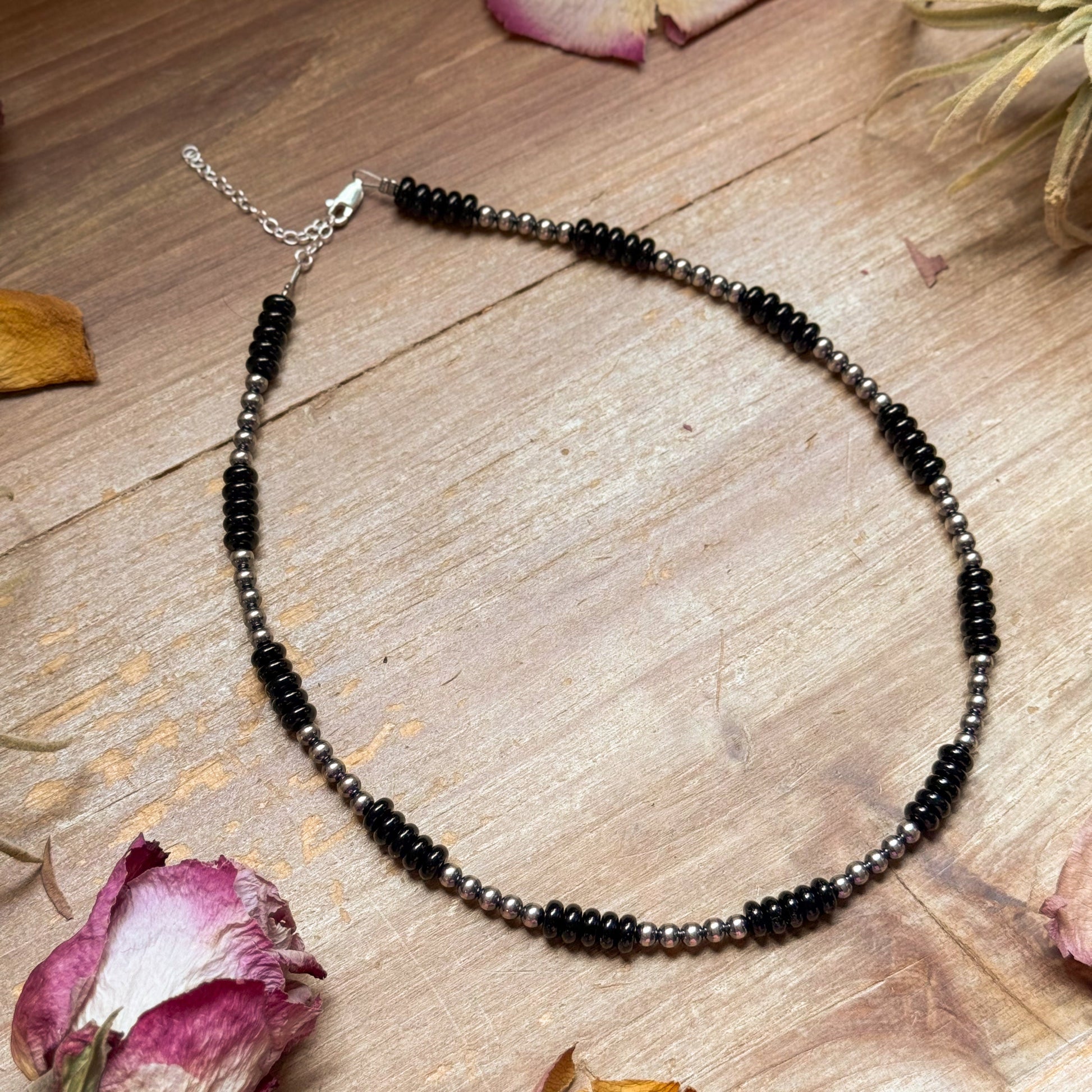 Designed with 4 mm sterling silver pearls paired with elegant 6 mm Black Onyx rondelles, this necklace delivers the perfect balance of shine and bold contrast.