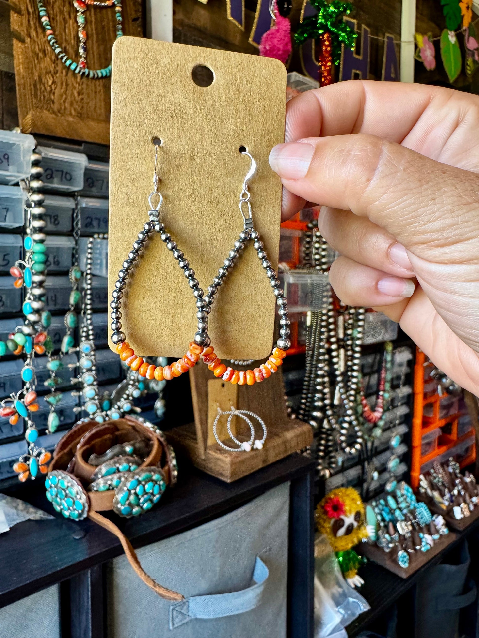 These handcrafted teardrop earrings are made by us in the USA using 3 mm sterling silver pearls and vibrant orange Spiny Oyster rondelle beads. The warm tones and natural variations make each pair one-of-a-kind. Lightweight, elegant, and perfect for everyday or summer wear.