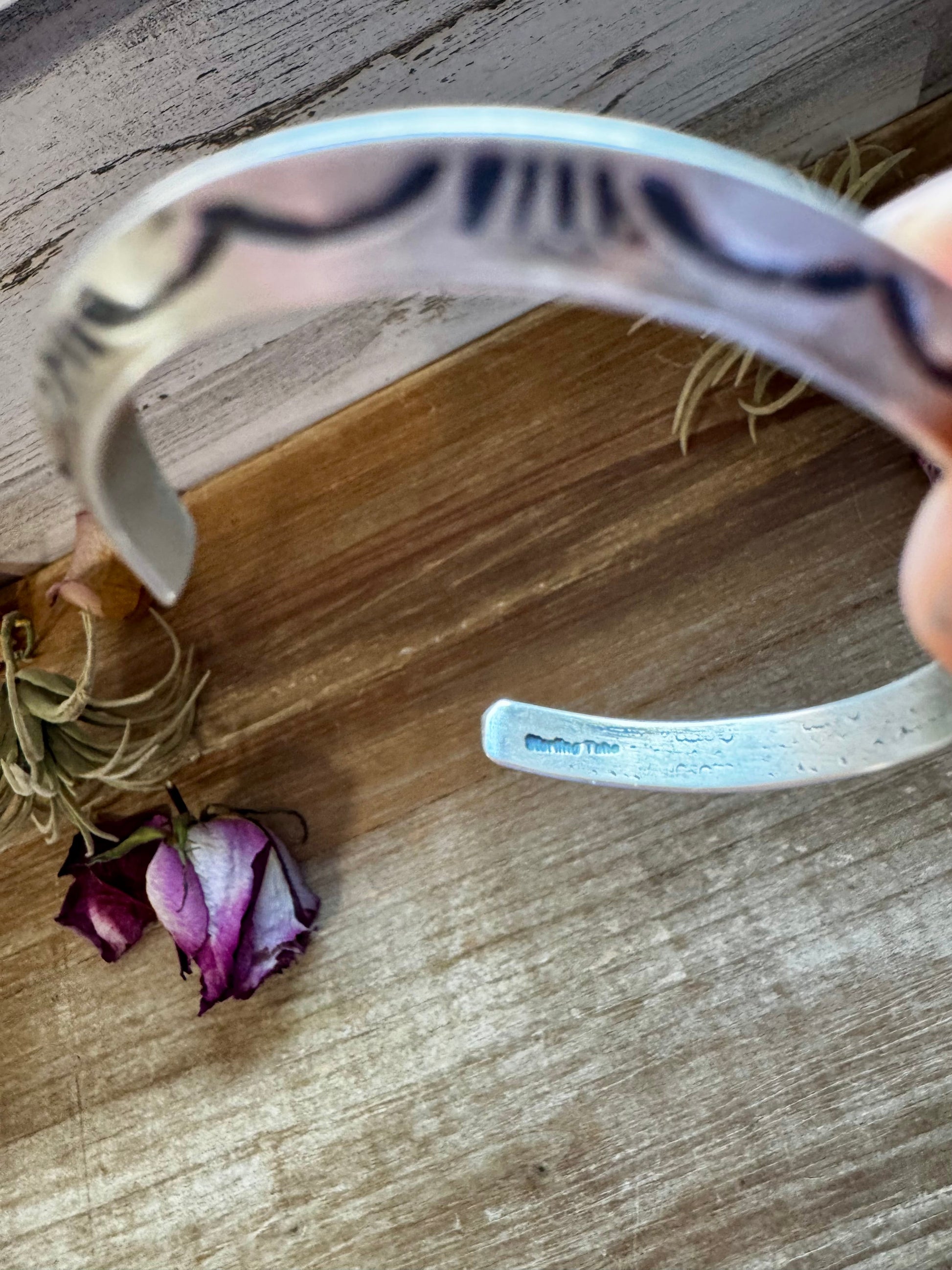 Handmade in the USA, these sterling silver turquoise cuff bracelets are Native made with bold silverwork and detailed stamping. Each cuff is thick, heavy-duty, and designed to last a lifetime. They are all by the same artist, though one cuff does not carry a visible stamp (the others are properly stamped). Despite this, it’s clear from the craftsmanship that all four pieces are from the same silversmith.